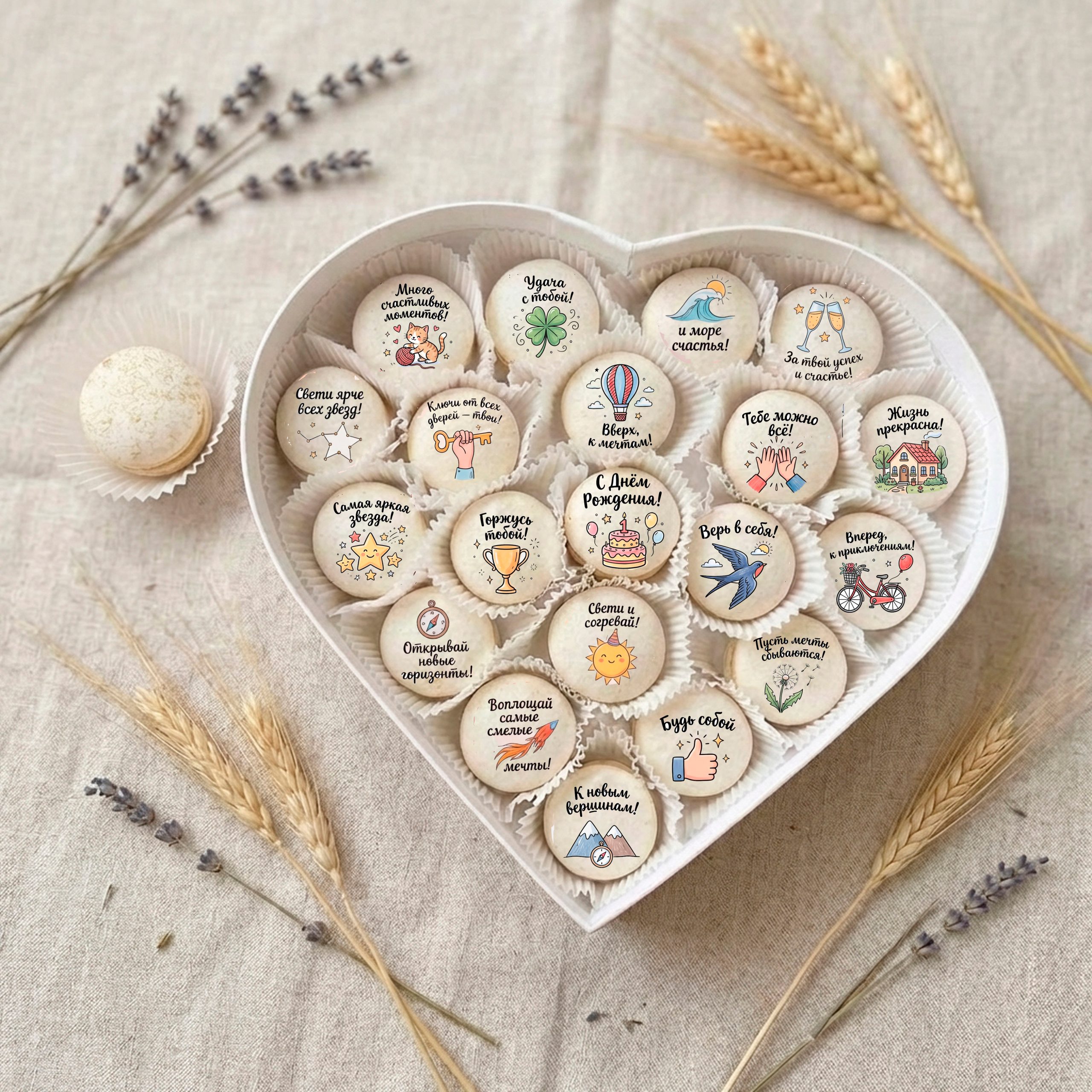 4 набора по 20 макаронс на день рождения. Вкусы: лесной орех, ванильный пломбир, фисташка, мята, кокос, соленая карамель, капучино, смородина, бабл гам, лесные ягоды, лаванда, малина. 1 набор трубочек со сгущенкой 10 штук. 2 набора с эклерами 3+12. Вкусы: эклеры Ваниль, карамель, смородина, фундук, макаронсы капучино, шоколад, апельсин шоколад, бабл гам, соленая карамель, лаванда.